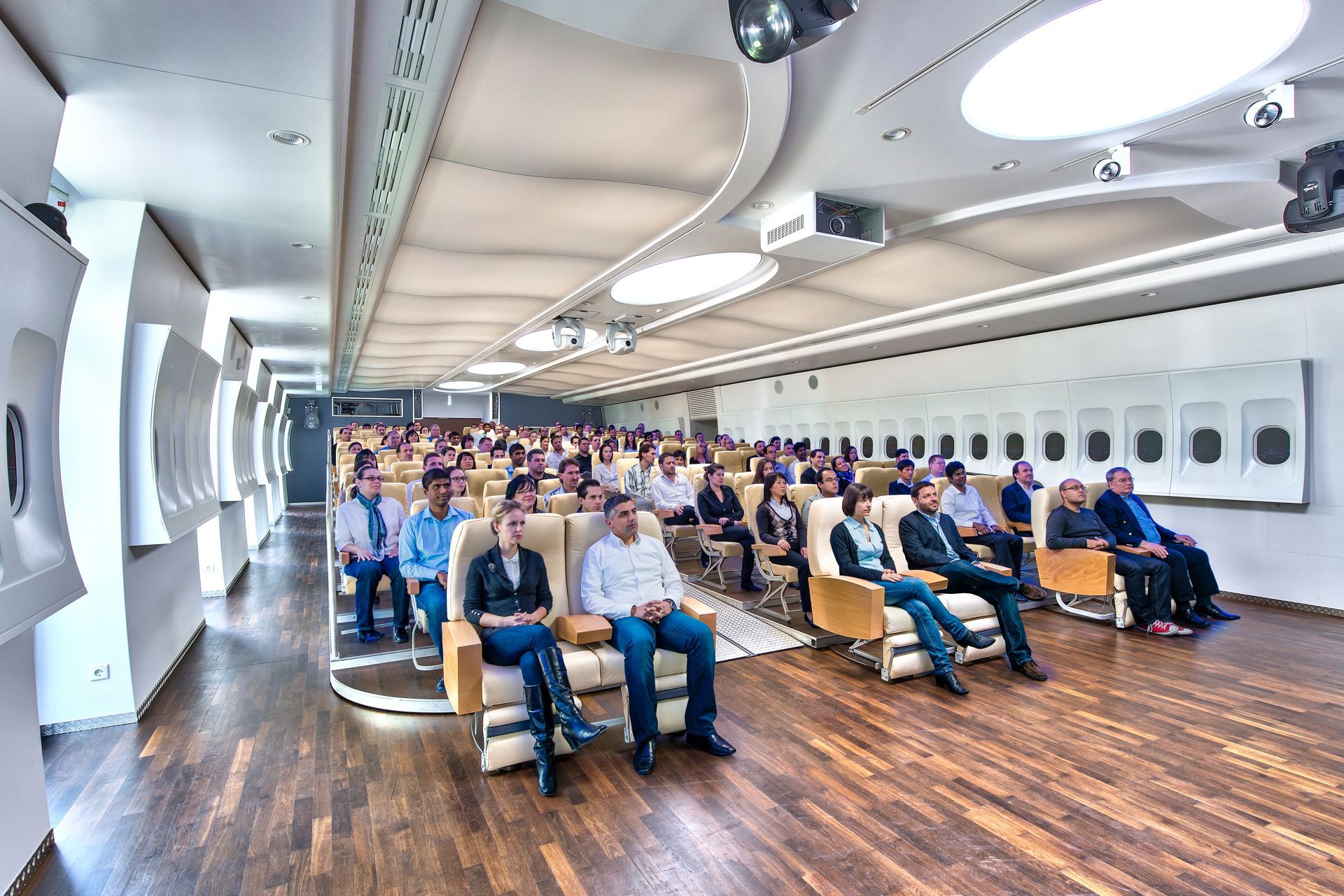 - 50 in die Seitenwände integrierte HD-Displays (Flugzeugfenster) zur Darstellung eines Fluges über LA