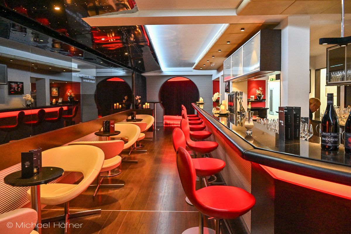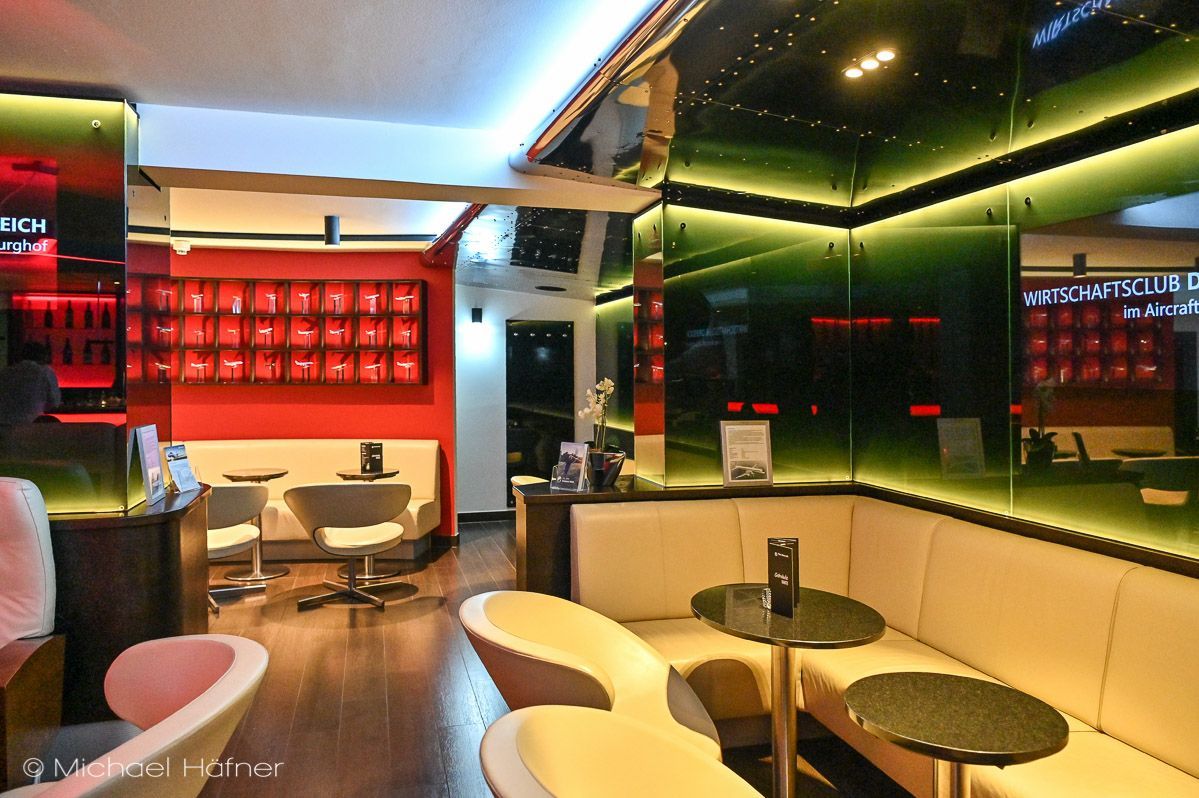 Durch ein Boeing 747 Triebwerk und eine kurze Gangway betritt man die Captain’s Lounge, stilvolle Bar und gemütlicher Rückzugsort in einem. Schickes Design und deckenhohe Glastüren vereint mit original Flugzeugteilen wie Firstclass-Flugzeugsitzen, Propellern und Turbinen, lassen ein besonderes Ambiente entstehen.