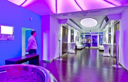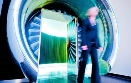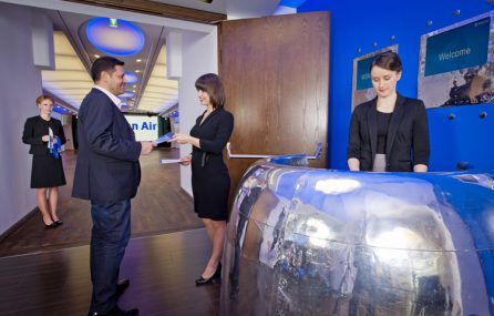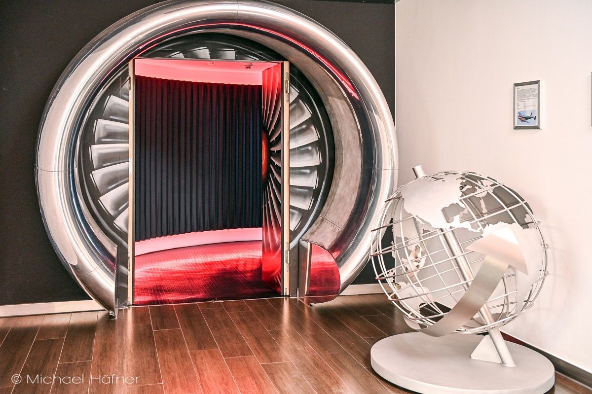 Umgeben von Original-Flugzeugteilen lassen sich auf Monitoren Filme, Präsentationen und Grafiken darstellen. Die LED Beleuchtung lässt sich mit 16,7 Millionen Farbmöglichkeiten auf individuelle Farbkonzepte abstimmen.